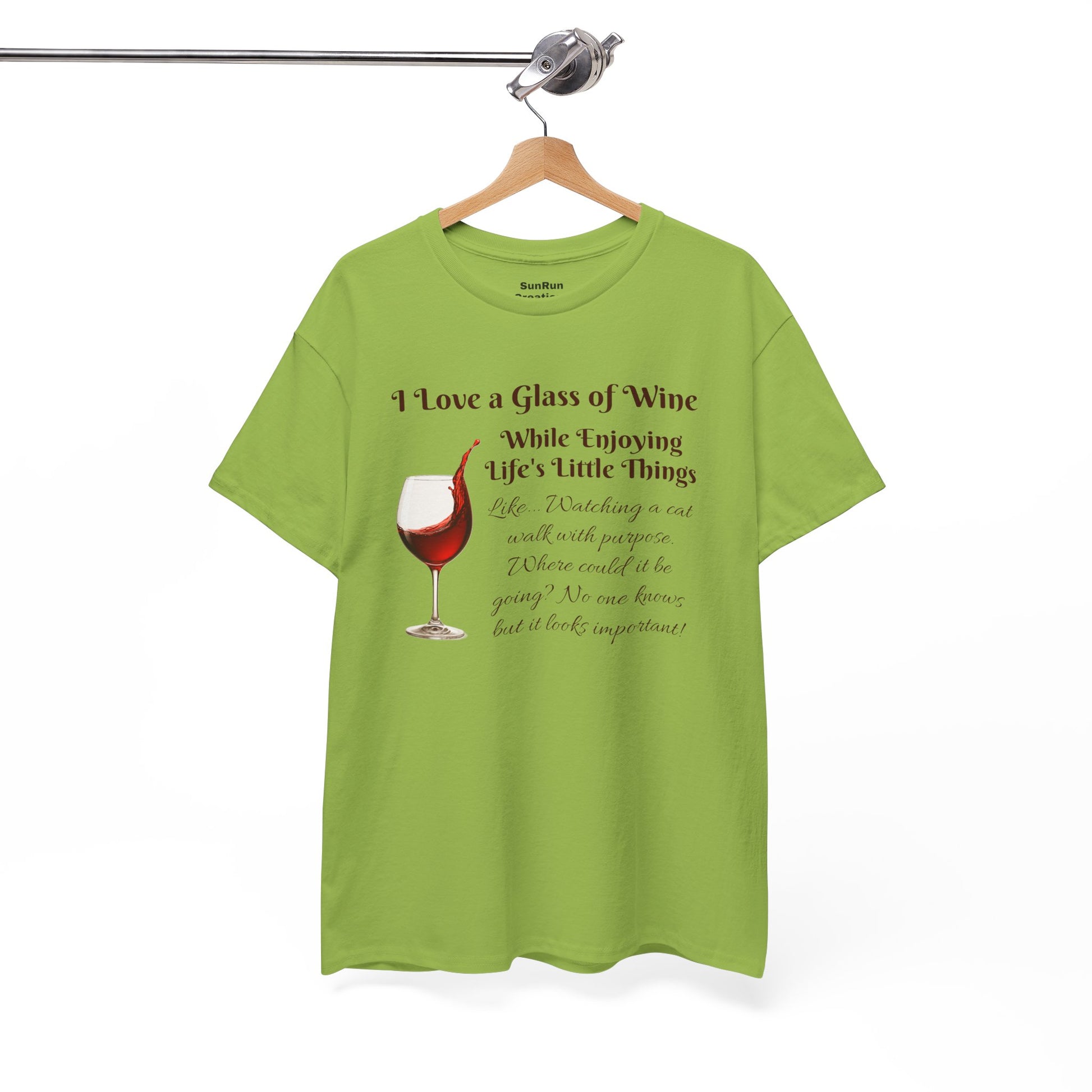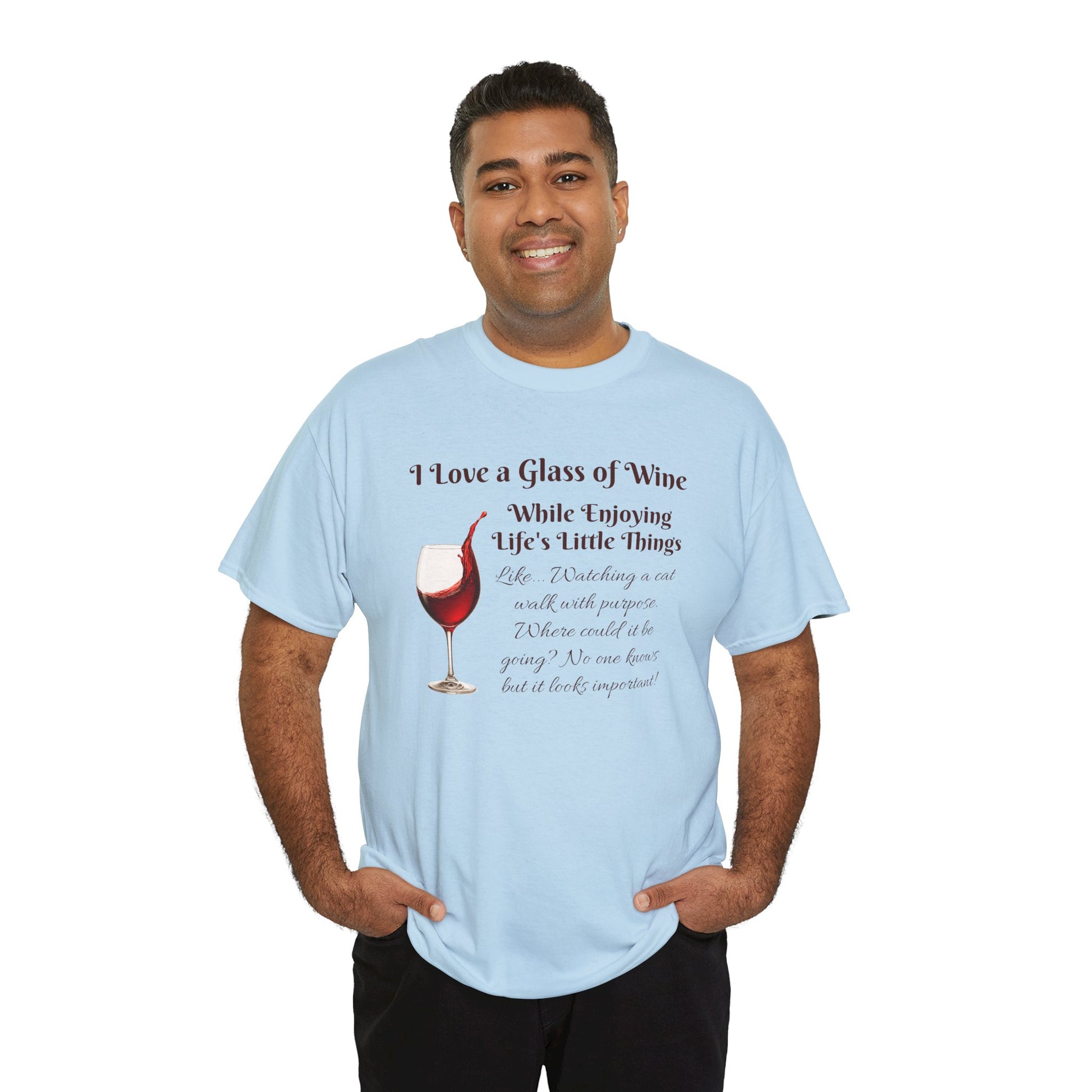 Celebrate the joy of sipping wine while contemplating the world’s quirks with this witty and cozy t-shirt. Featuring a charming illustration of a wine glass and a playful message, this shirt is perfect for those who appreciate the finer things in life—Like... Watching a cat walk with purpose. Where could it be going? No one knows but it looks important!